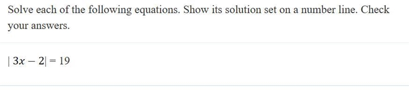 Solve each of the following equations. Show its solution set on a number line. Check your answers. |3x-2|=19
