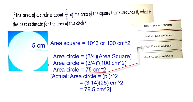See the attached worksheet. 75 cm^2 is the area of the circle using the (3/4) relationship. It is actually 78.5 cm^2 using the area of a circle equation.