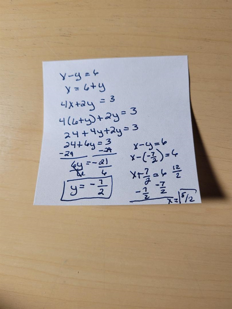 Solve the simultaneous equations 4x+2y=3 x-y=6
