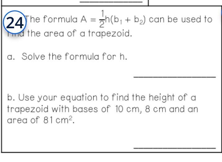A = 1/2 h ( b1 + b2) divide both sides by ( b1+b2)