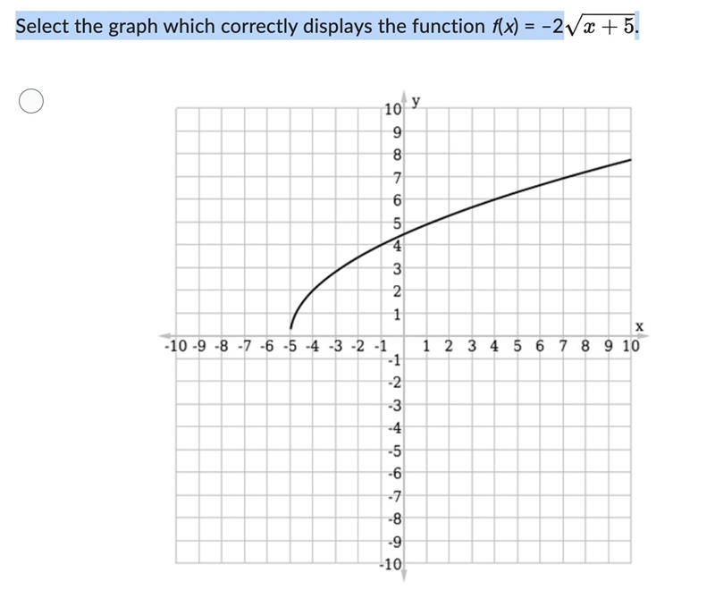 Select the graph which correctly displays the function f(x) = –2 √x+5