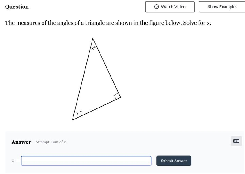 Angles in a right triangle add to 180 degrees. 180-90-51=39