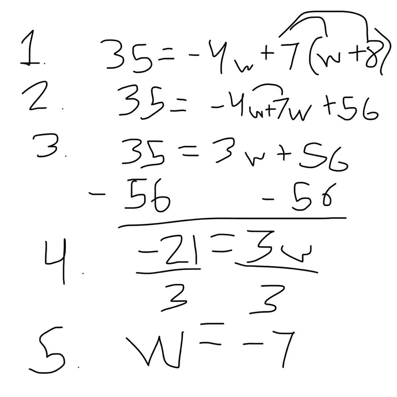 35 =-4w+7(w+8) I need help please I keep trying but im getting the wrong answer