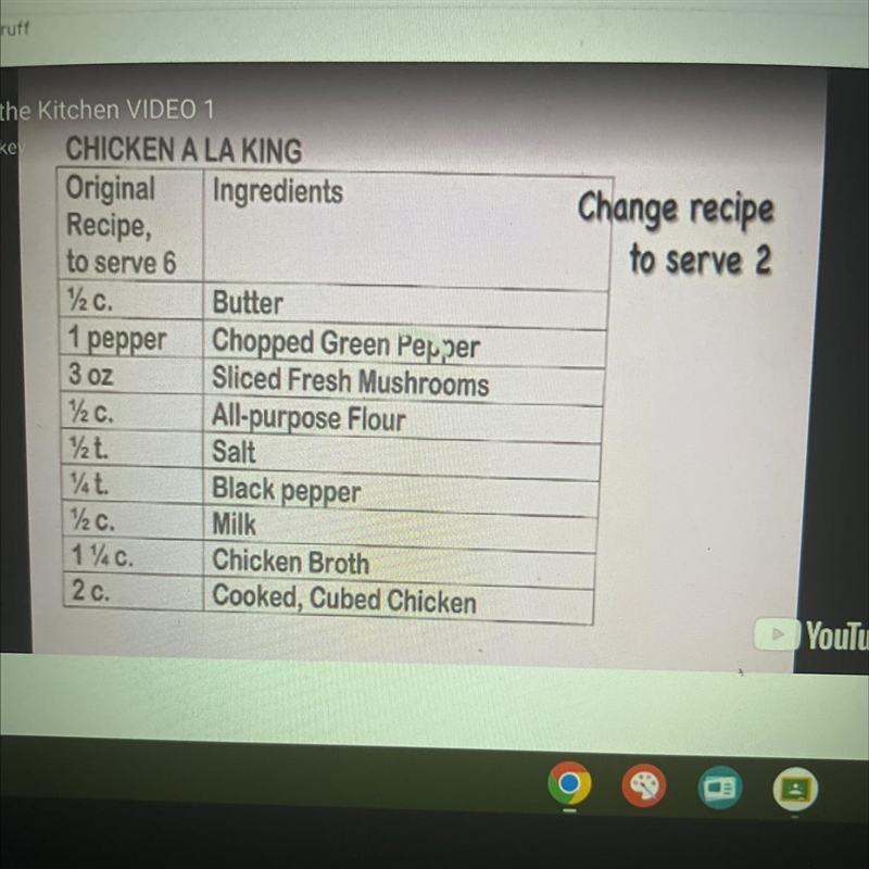 What is the conversion factor for this recipe? (What do you need to do to the recipe to make 2 servings?) Divide by 1/2 Divide by 3 Divide by 2