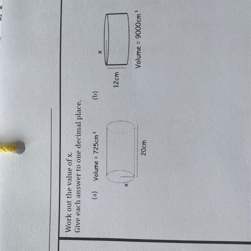 Work out the value of x. Give each answer to one decimal place. (a) Volume = 725cm³ X 20cm (b) 12cm X Volume 9000cm³