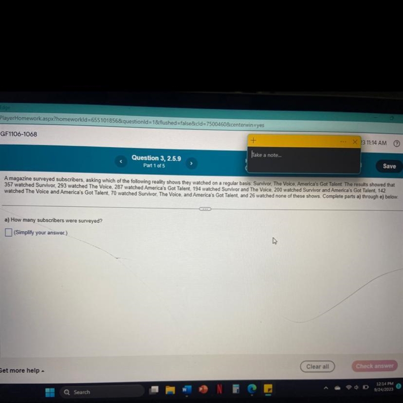 You just have to add up all of the people that were surveyed. If needed, simplify.