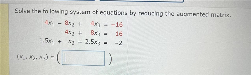 You want the solution to the given system of equations by reduction of the augmented matrix.
