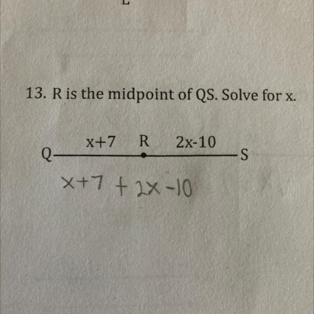 set the two segments equal to each other and then subtract x from both side and add ten to both sides to get x = 17