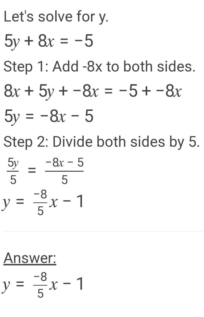 Step 4: Divide both sides of the equation by 5 to solve for y. This gives us: y = (-8x - 5) / 5.