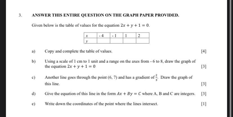 a) To complete the table of values for the equation 2x + y + 1 = 0, you can substitute the given x-values into the equation to find the corresponding y-values. Here's the completed table of values: