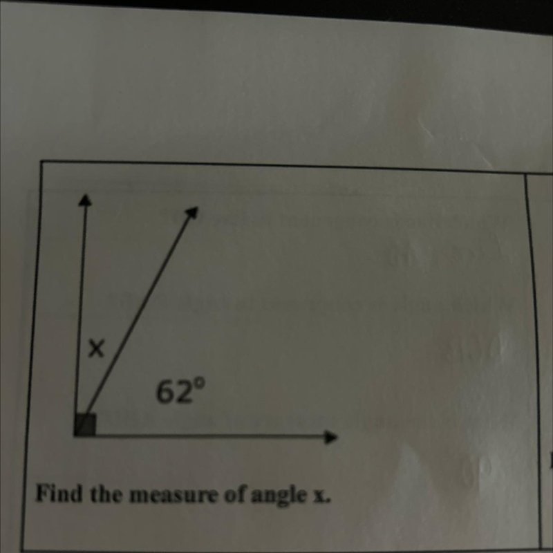 One piece of it is 62 degrees, so the other piece is just 90-62=28 degrees.