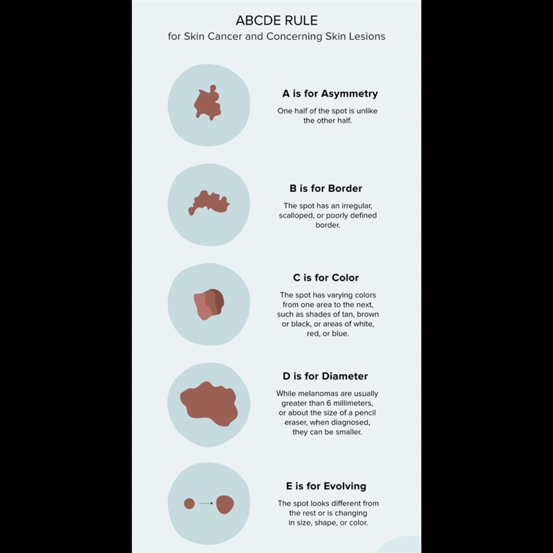 The American Cancer Society recommends using a checklist to recognize potential skin cancer or changes in moles, using the letter B to check mole: a. Asymmetry. b. Border irregularity. c. Color variation.