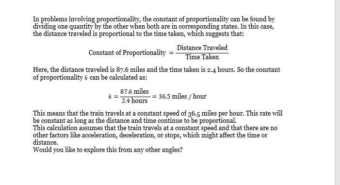 A passenger train traveled 87.6 miles in 2.4 hours. The distance traveled is proportional to the amount of time. What is the constant of proportionality? Express your answer in …