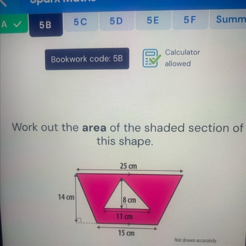 to find the area of the shaded region we must find the area of the trapezoid (b1+b2)*h/2 and remove the area of the triangle (b*h:2), all by setting the expression below