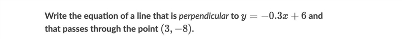 To find the equation of a line that is perpendicular to y = -0.3x + 6 and passes through the point (3,-8), we can follow these steps: