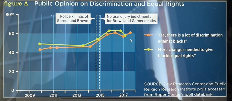 Figure A. Public opinion on discrimination and equal rights J(Q001) This feature provides an explanation of the public opinion and policy responses to the murders of Michael Brown, Eric Garner, and George Floyd by police and subsequent protests of the Black Lives Matter (BLM) movement. After the murders of Brown, Garner, and Floyd, public opinion became more supportive of racial justice policies-including among Republicans in response to Floyd's killing. However, Republican sentiments quickly shifted away from that position-as the political narrative of Trump and other elite Republicans turned against the cause of racial justice, so too did the views of Republicans in the general public. Coupled with a decline in news coverage about these unjust killings, we observe a stark divide between Republican and Democrat views on race and policing.