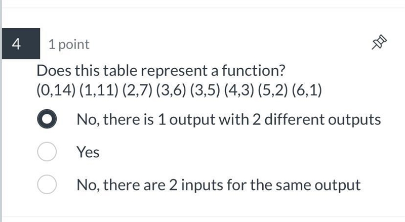 Does this table represent a function? (0,14) (1,11) (2,7) (3,6) (3,5) (4,3) (5,2) (6,1)