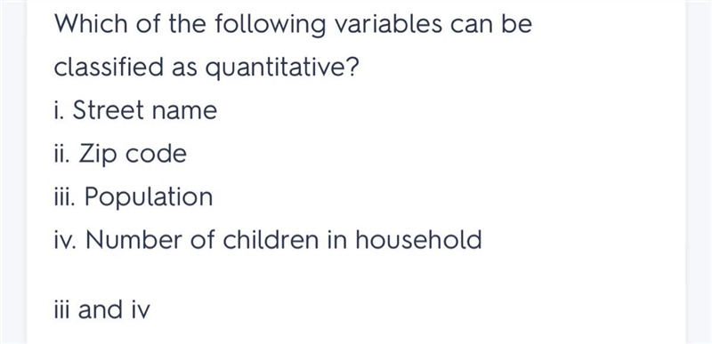 Which of the following variables can be classified as quantitative? Street name Zip code Population Number of children in household