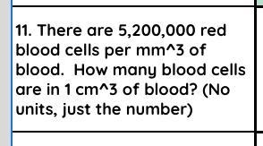 Therefore, the number of blood cells in 1 cm^3 of blood would be: 5,200,000 / 1000 = 5200 blood cells.