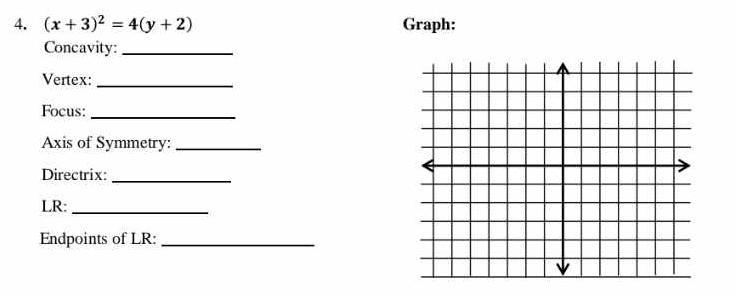 To solve the equation (x + 3)² = 4(y + 2) and determine the characteristics of the graph, we can use the standard form of a parabolic equation: (x - h)² = 4p(y - k), where (h, k) represents the vertex and p represents the distance between the vertex and the focus.