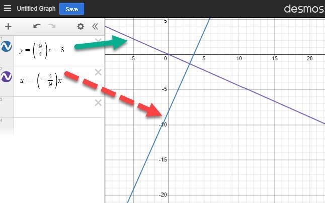 Line u is perpendicular to this line, so its slope will be the negative inverse of line t, or -(4/9)