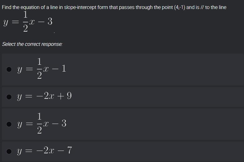 Find the equation of a line in slope-intercept form that passes through the point (4,-1) and is // to the line y = 1/2x - 3.