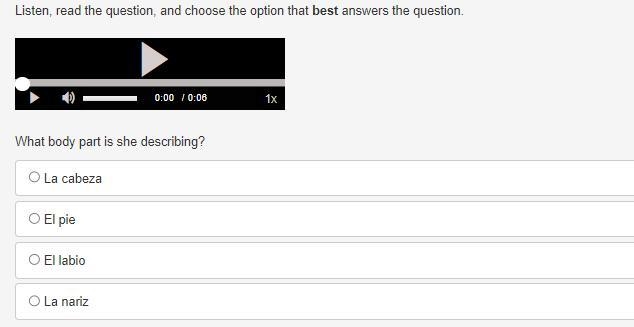 Listen, read the question, and choose the option that best answers the question. What body part is she describing? La cabeza El pie El labio La nariz