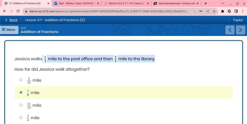 Sorry if I’m wrong but you need to find the common denominator which is 15 so you would times 1/3 by 5 so you have 5/15 then times 2/5 by 3 so you’ll have 6/15. 5+6 = 11 you don’t add denominators obviously.