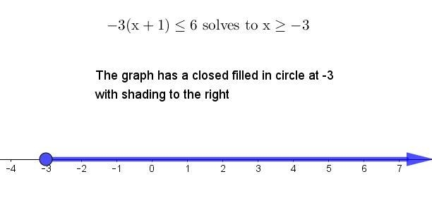 The number line graph will have a closed filled in circle at -3 and shading to the right. This will visually mean "The solution set is either x = -3 or x > -3". In other words, we can pick -3 or larger.