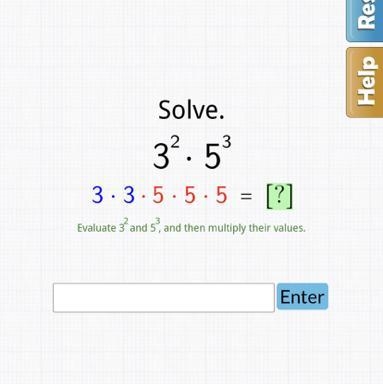 Step-by-step explanation: 3 to the power of 2 = 9. 5 to the power of 3 = 125. 125x9=1,125