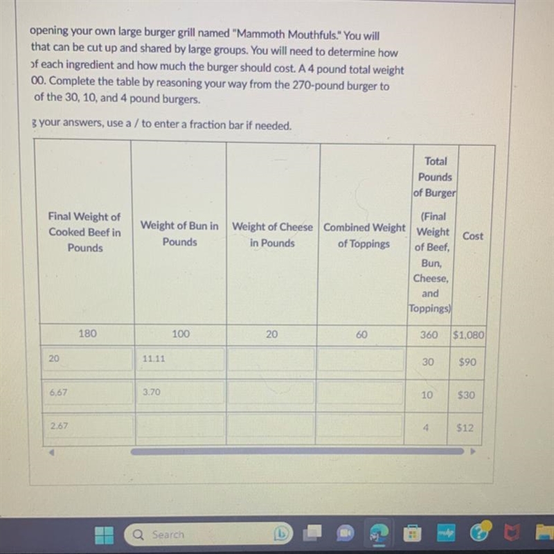 To calculate the total cost per burger size, you'll need to use the determined costs per pound for each ingredient:
