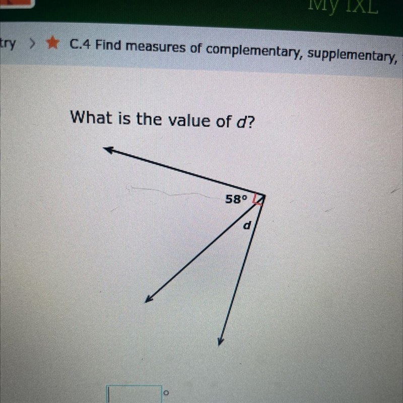 Step-by-step explanation: Complementary angles, which means two angles that sum to 90. 90 minus 58 = 32, missing angle is 32.