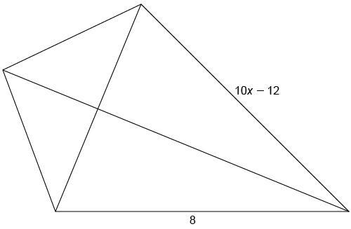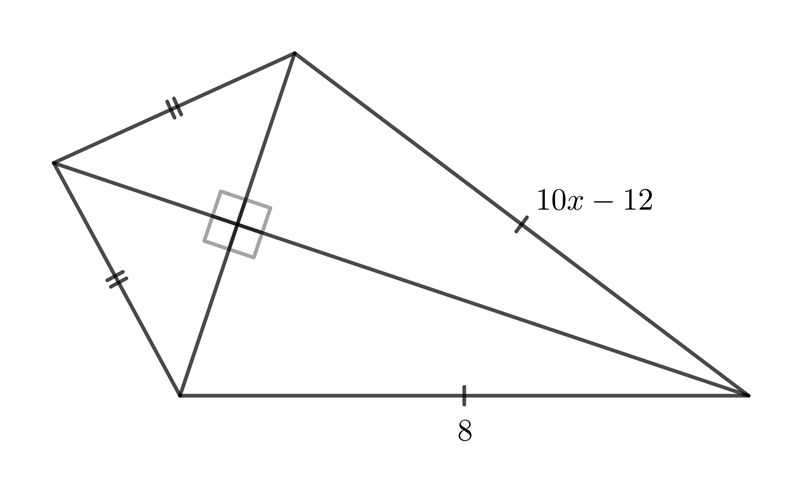 The given diagram shows a kite where the pair of longest congruent adjacent sides are labelled (10x - 12) and 8. To determine the value of x, set the expressions for these congruent sides equal to each other and solve for x.