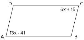 Since opposite angles of a parallelogram are congruent, we can find the value of x by setting the expressions for opposite angles A and C equal to each other and solving for x: