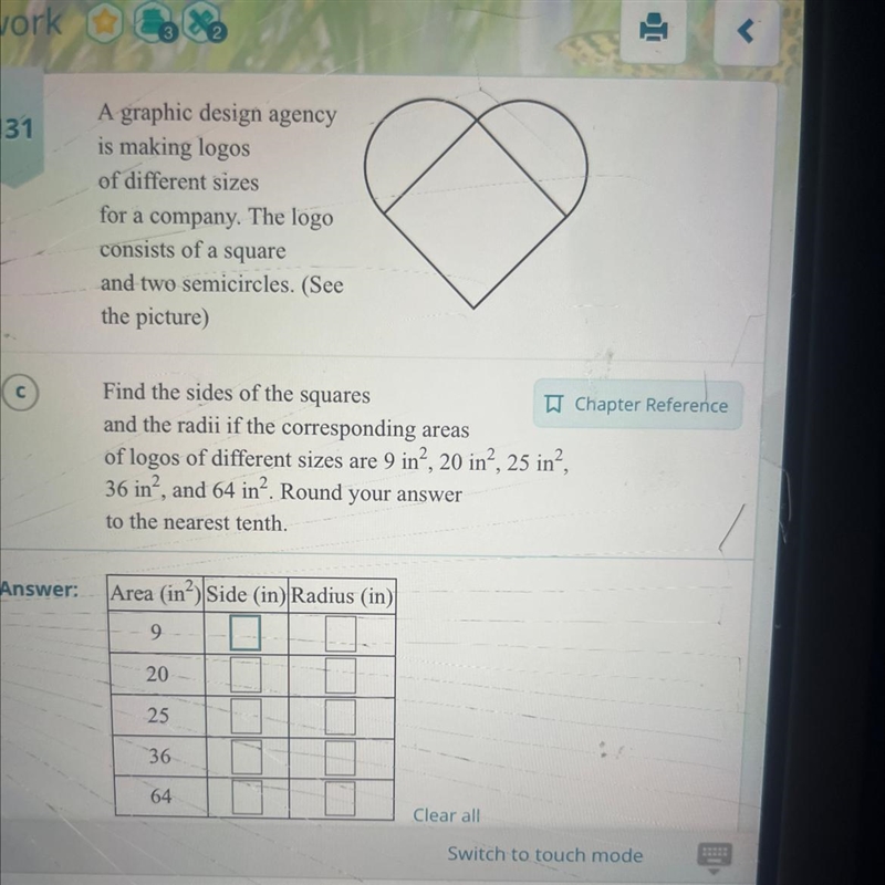 Therefore, the side length of the square is 3.3 in and the radius of the semicircles is 1.7 in (rounded to the nearest tenth).