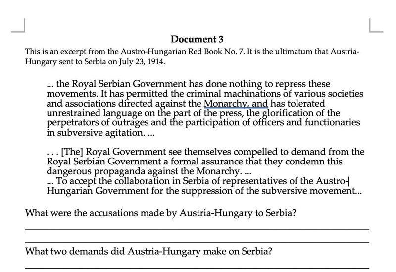 Answer: Austria-Hungary is saying that Serbia supporting terrorist groups and criminal organizations. They were also saying that they are pushing anti-Austria-Hungary propaganda