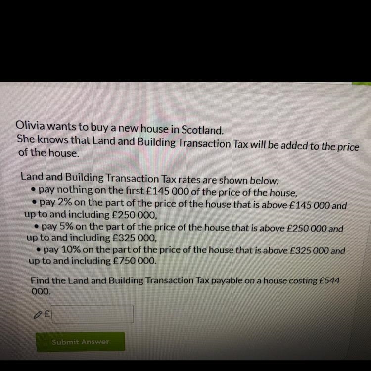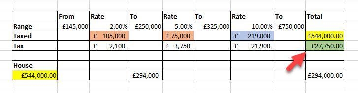 The top row shows the range and tax rate for the home value. (e.g., From £145,000 to £250,000), the tax rate is 2%).