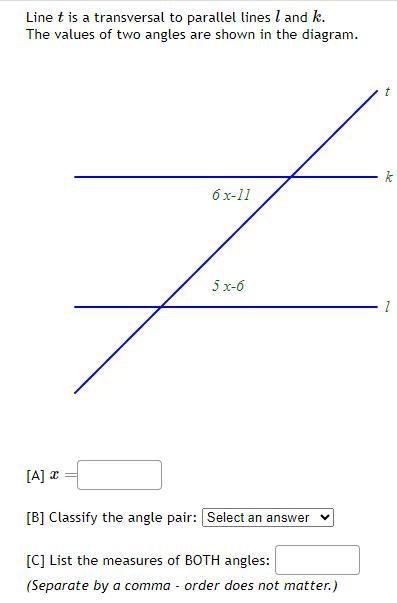 Step-by-step explanation: Since alternate interior angles they are equal hence equate 6x-11 = 5x-6
