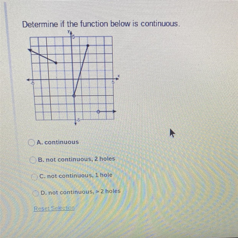 Someone please help! Determine if the function below is continuous. A. not continuous, 1 hole B. not continuous, > 2 holes C. continuous D. not continuous, 2 holes
