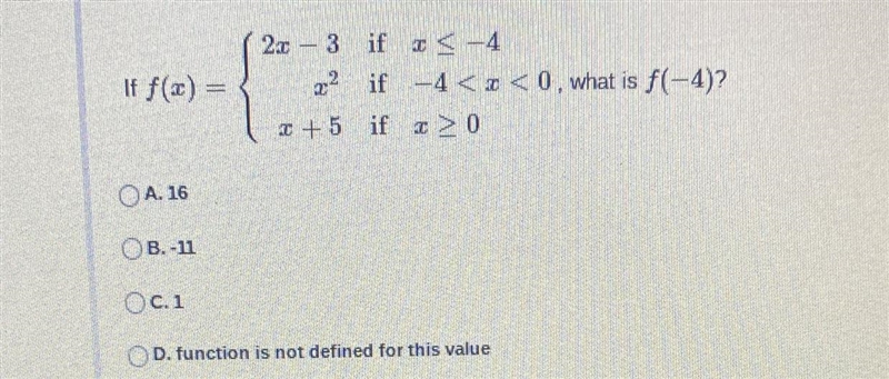 Please help me! A. 16 B. -11 C. 1 D. function is not defined for this value