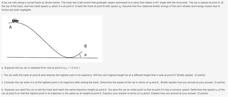 i. We can use the concept of conservation of mechanical energy to solve this problem. Since we know that the car will be at rest at a height of A, the car will have some kinetic energy due to its velocity and some potential energy due to its height. Once the car is at its highest height off the track, the car cannot reach a height of A again since it will still be moving forward from being released. When all the kinetic energy is transformed into potential, the car would have to be at rest.