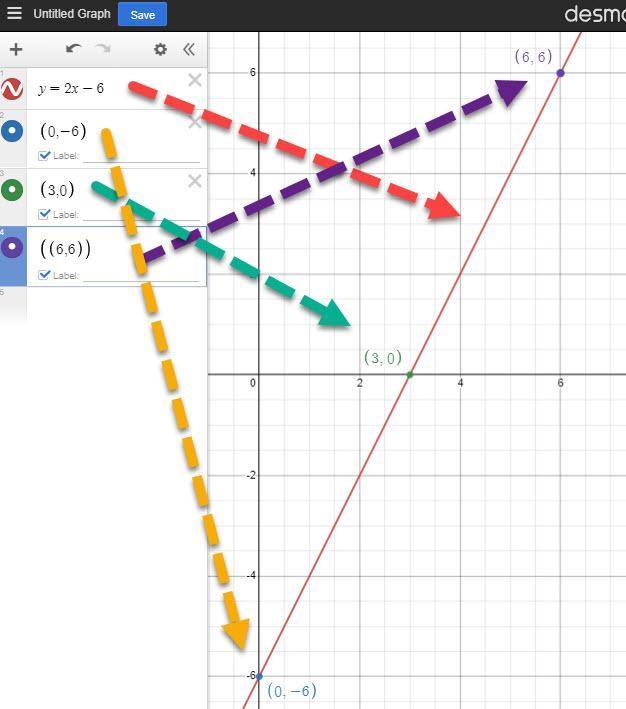 The yellow line shows the location of the y-intercept, at (0,-6), which comes from the b (-6) in the equation. The change in y between the points (3,0) and (6,6) show that the slope is 2, since when x changed by 3, a change in y of 6 is observed. The ratio of the changes in y/x is the slope [(6/3) = 2].