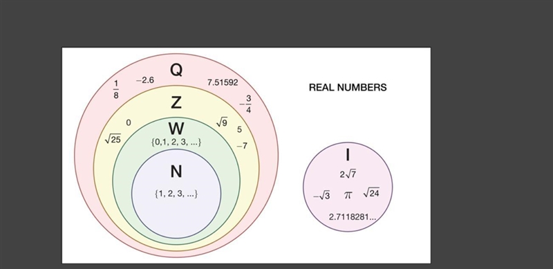 Rational numbers (set Q) and irrational numbers (set I) are both real numbers.