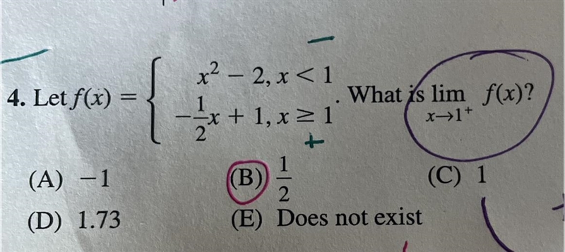 This is a peice wise function and we are given that the limit of x is 1+, so we will use direct substitution to plug 1 into the second equation (1+ is greater than or equal to 1). Then using direct substitution, -1/2(1)+1=1/2