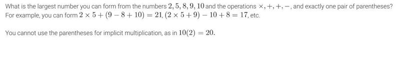 You want the largest possible number that can be made from the operations {×, +, +, -} on the numbers {2, 5, 8, 9, 10} using only one set of parentheses.