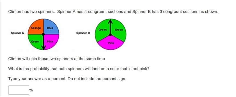 chance that Spinner A will land on the color pink, and there is a 1/3 chance Spinner B will land on the color pink. Since these events are independent (the result of one doesn't impact the result of the other), you can multiply these two probabilities together.