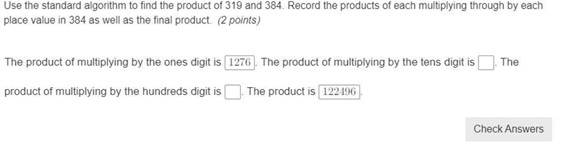 Add these all together to find your final product: 1276 + 25520 + 95700 = 122496. So the product of 319 and 384 using the standard algorithm is 122496.