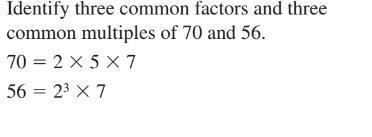 To find the common factors and common multiples of 70 and 56, we need to first find the prime factorization of both numbers. You have already done that for 70 and 56, so let’s write them down: