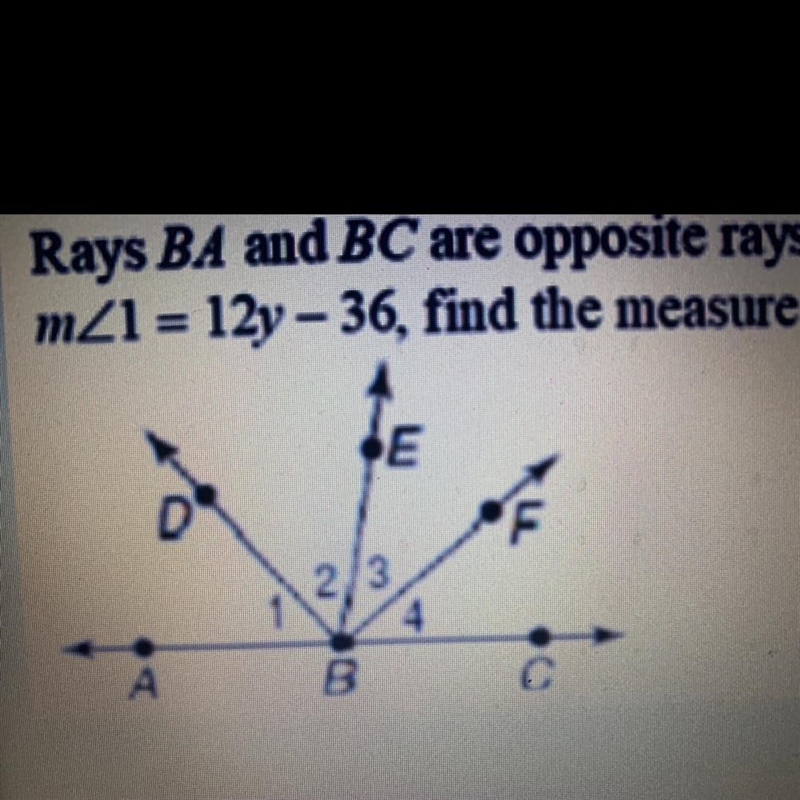 Rays BA and BC are opposite rays, ray BF bisects angle CBE and ray BD bisects angle ABE. If m<2 = 8y+4 and m<1 = 12y-36, find the measure of angle ABE.
