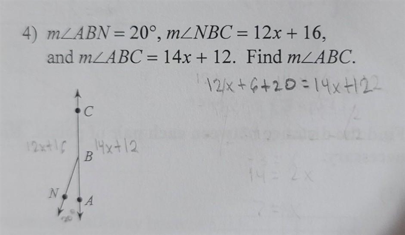 4) m/ABN= 20°, m/NBC = 12x + 16, and m/ABC = 14x + 12. Find m/ABC. i got 7 the first time but apparently it's incorrect because the angle 14x + 12 should be 189